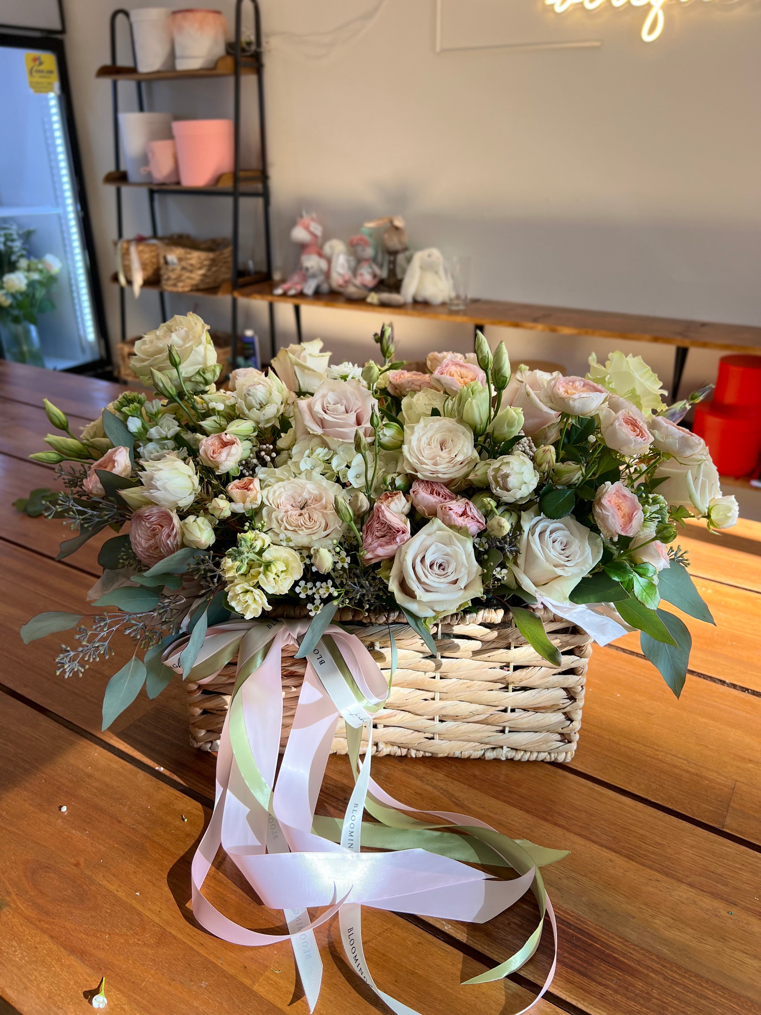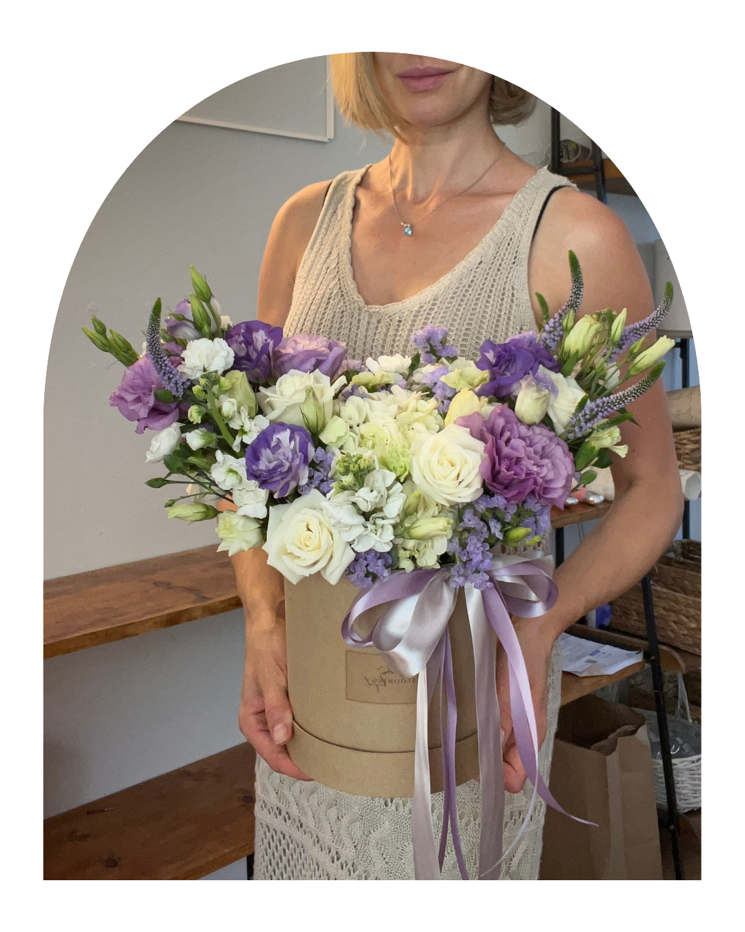 These are stylish and elegant floral arrangements presented in decorative boxes. This format is convenient, requires no vase, and is perfect for gifts designed with a special touch of taste.