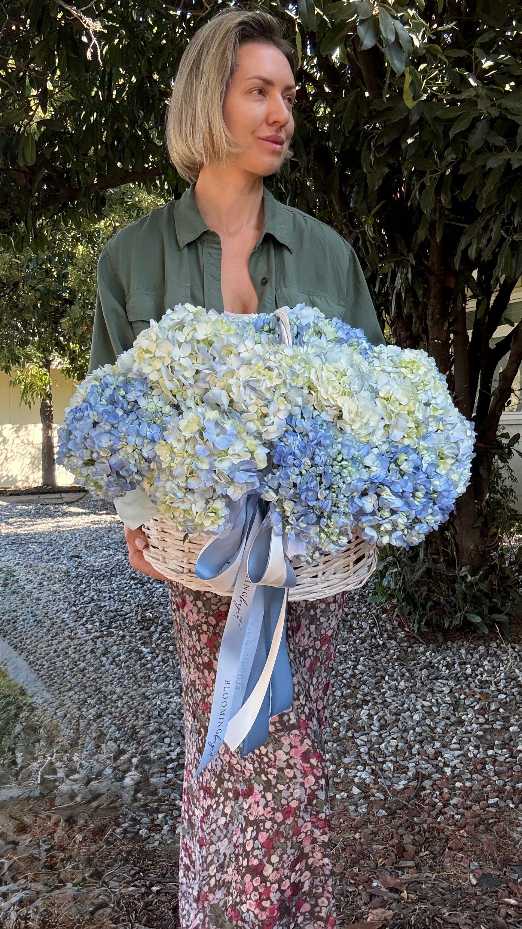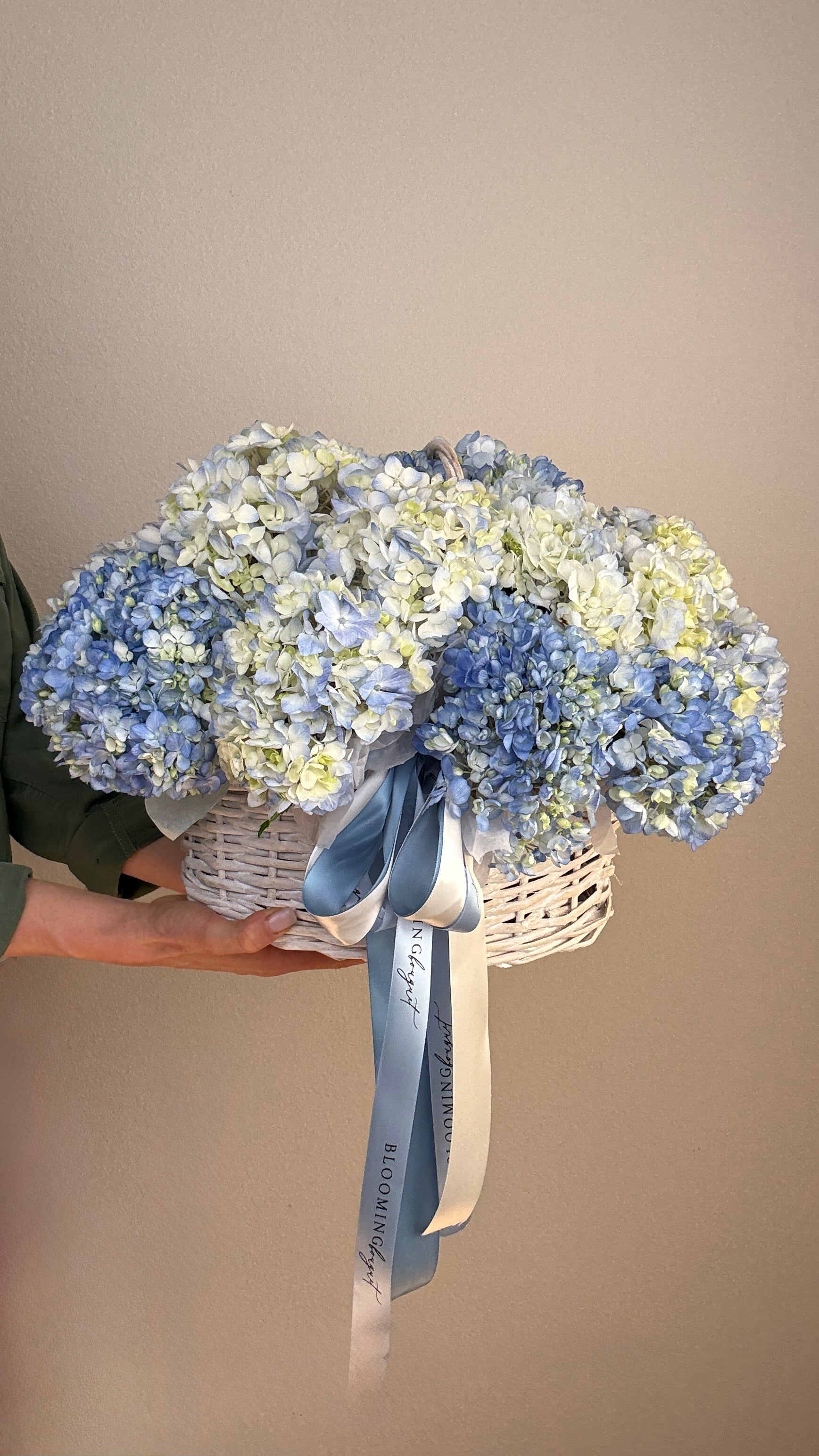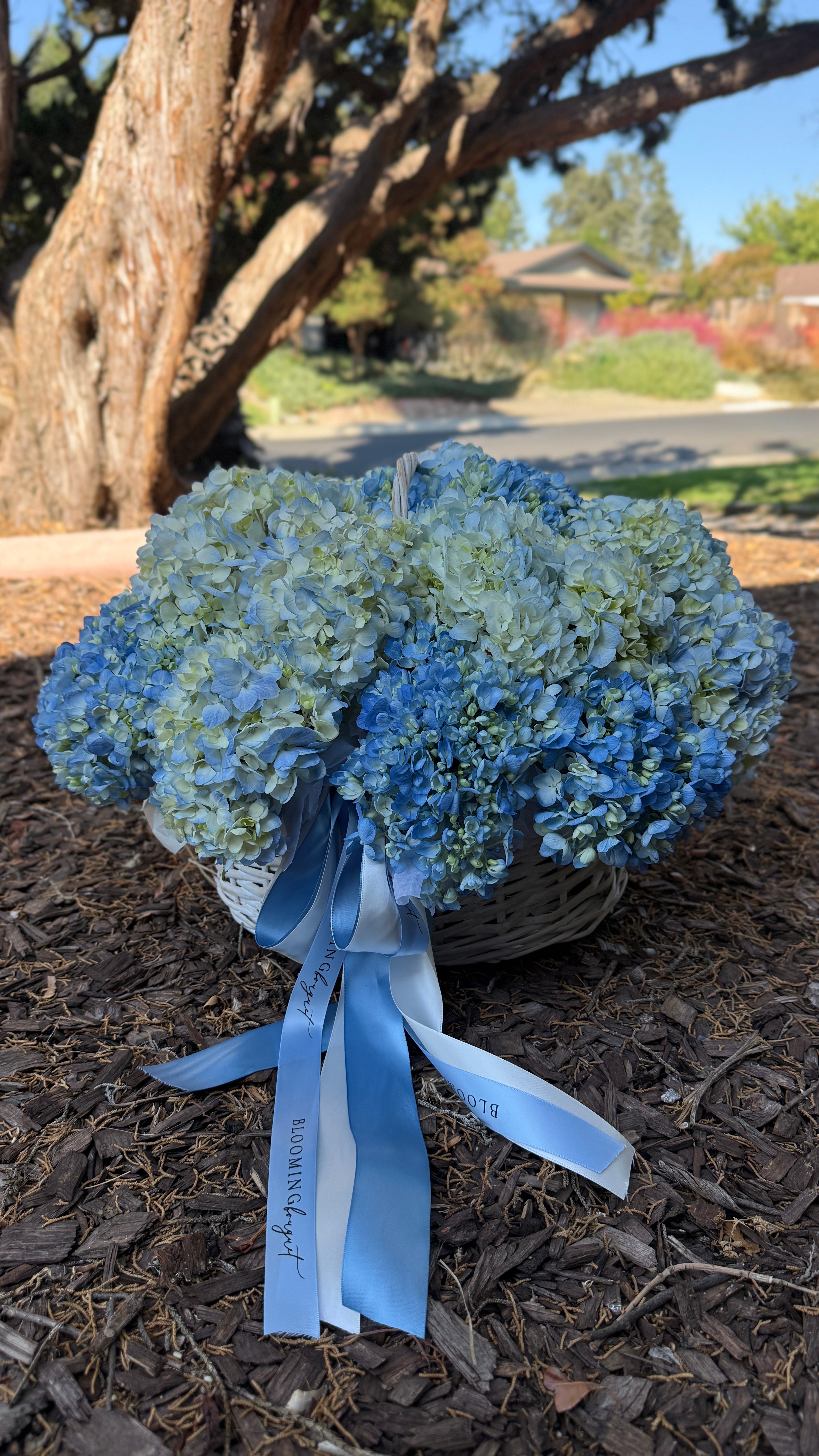 Discover the elegance of our Blue Hydrangea Basket, a breathtaking floral arrangement designed to impress with its soft charm and timeless beauty. This basket features lush blue hydrangeas as the centerpiece, that create a graceful balance of color and texture.