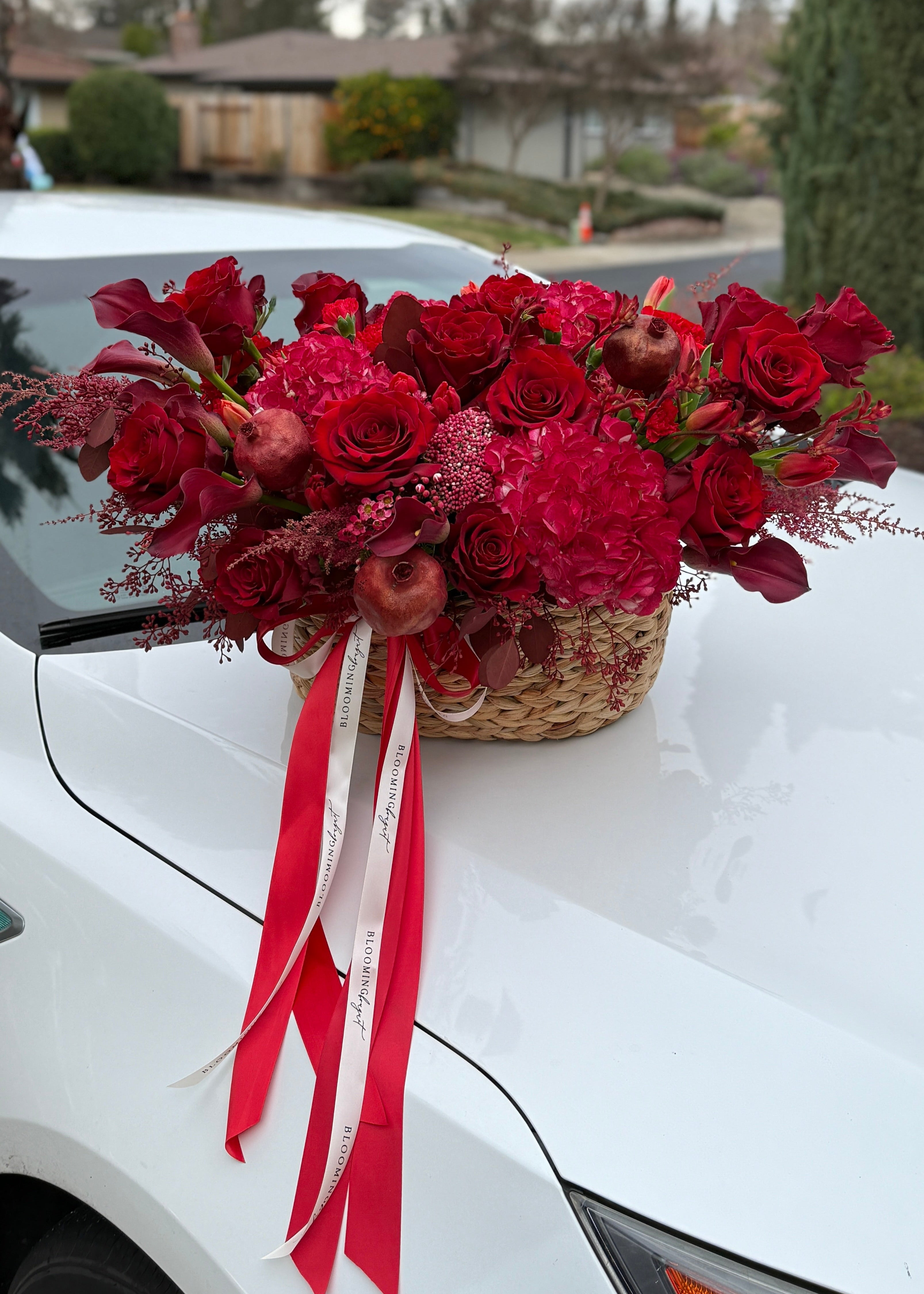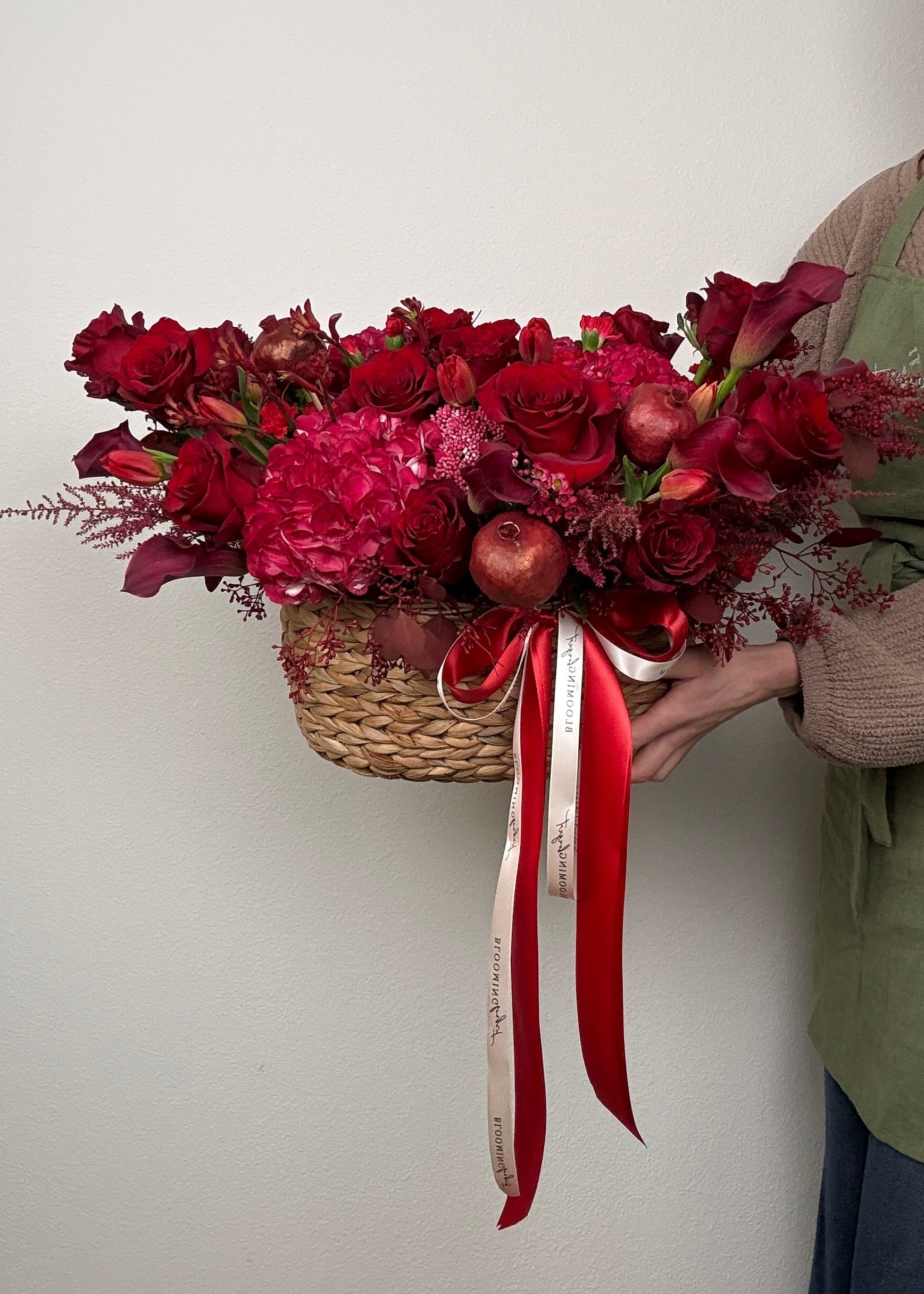 This exquisite floral arrangement features a luxurious blend of red hydrangeas, premium roses, spray roses, tulips, and two types of carnations. Complemented by elegant calla lilies, decorative greenery, eucalyptus, and statice, this basket exudes timeless sophistication. The addition of ornamental pomegranates and azatamus adds a unique touch, symbolizing prosperity and abundance. Designed in a woven basket with flowing satin ribbons, this arrangement is perfect for romantic gestures, anniversaries, or special celebrations. A stunning statement piece, it brings warmth and elegance to any occasion.