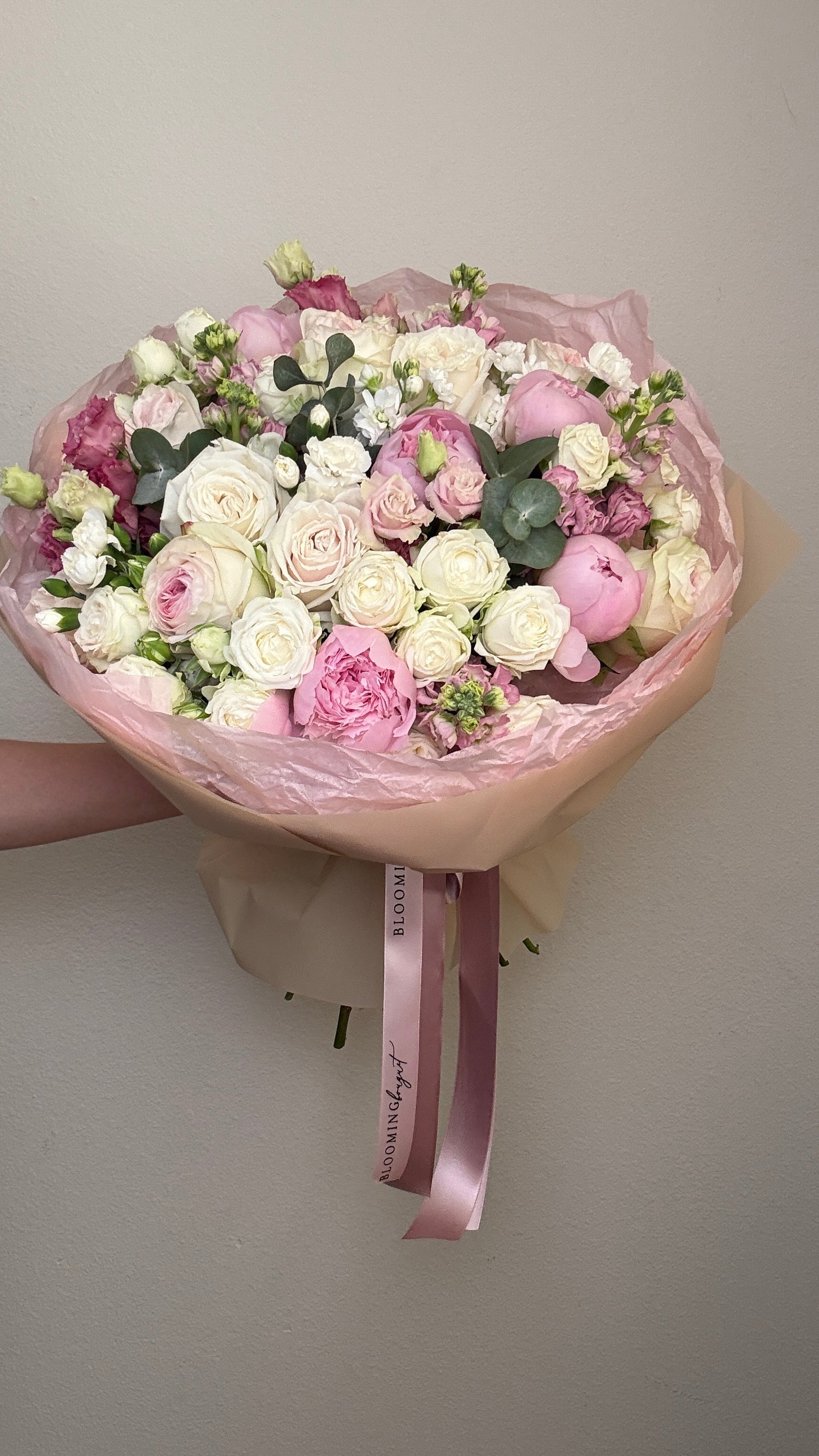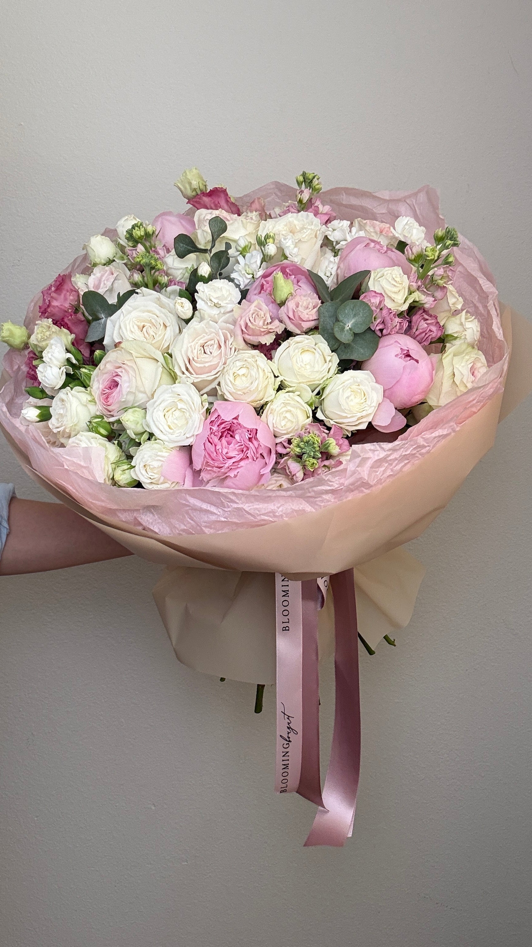 Include: Peonies , Stock , Carnation, Roses, and Spray roses