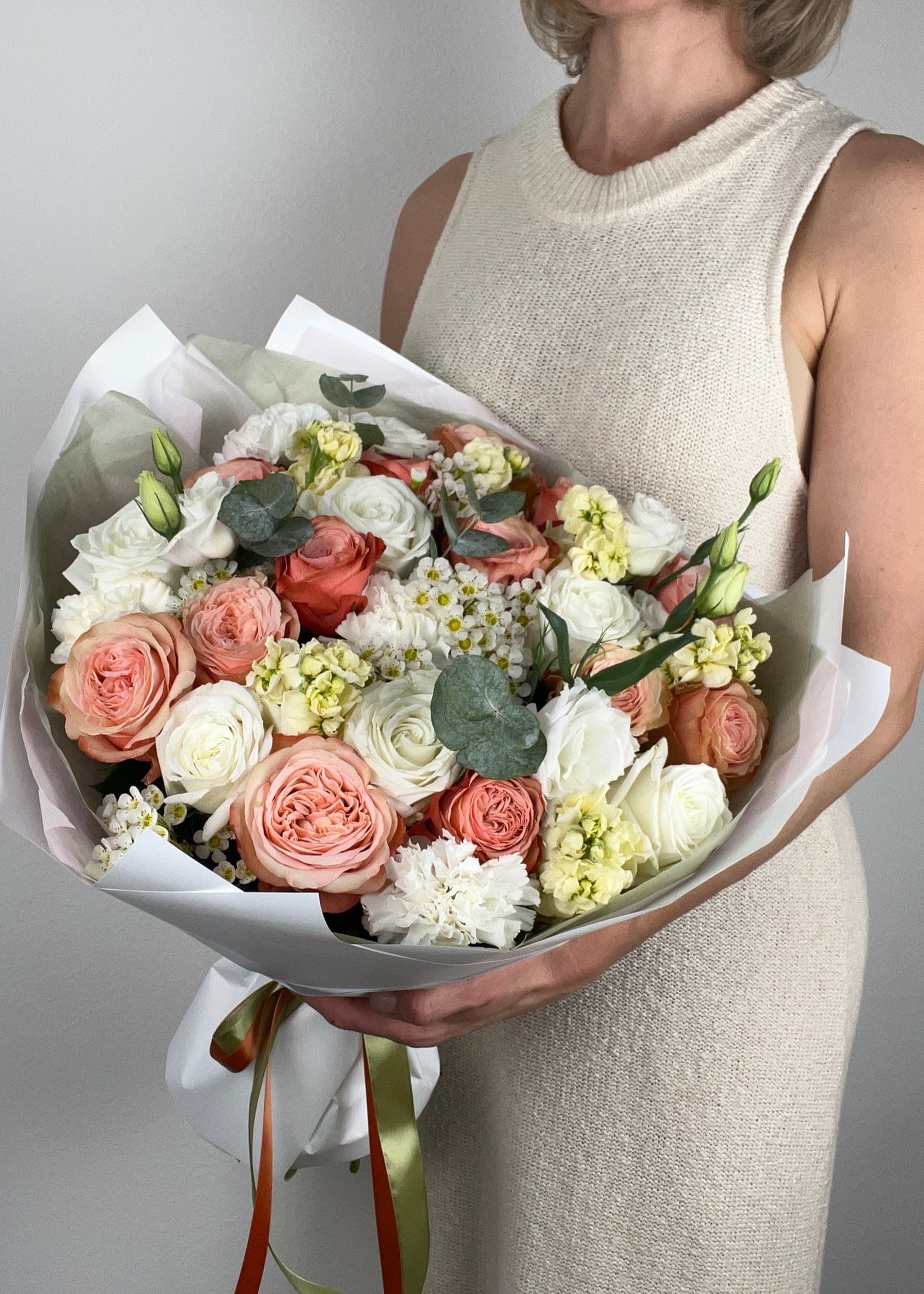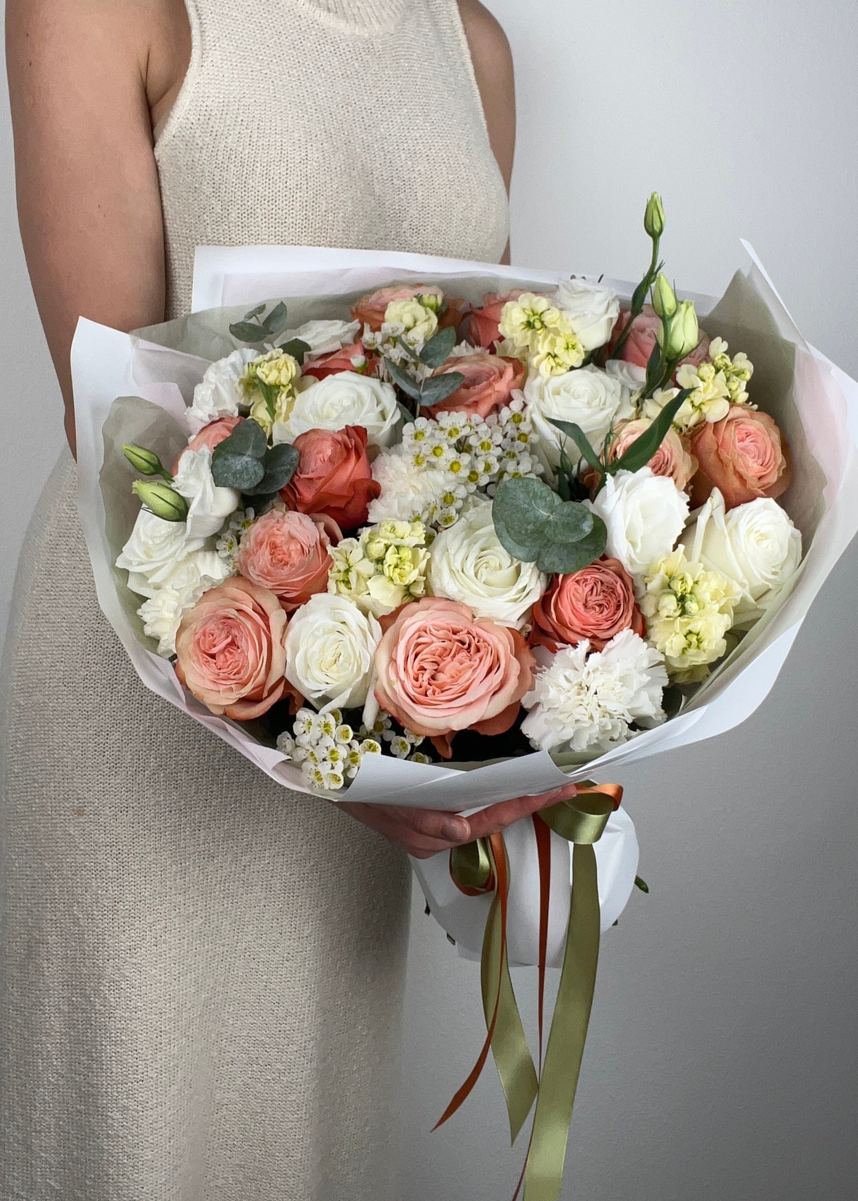 Include: Roses, Carnations, Waxflower, Lisianthus, and Matthiola