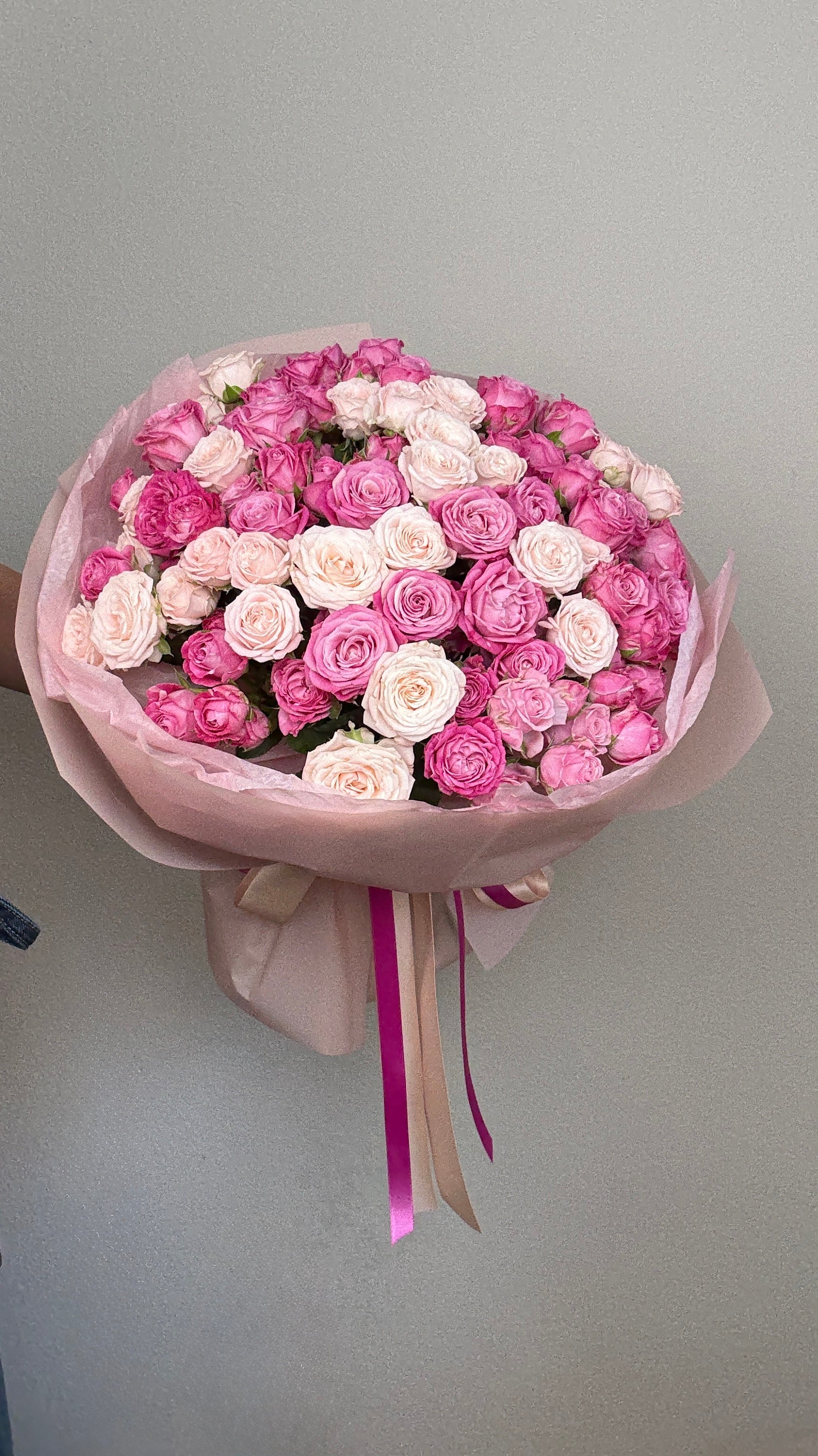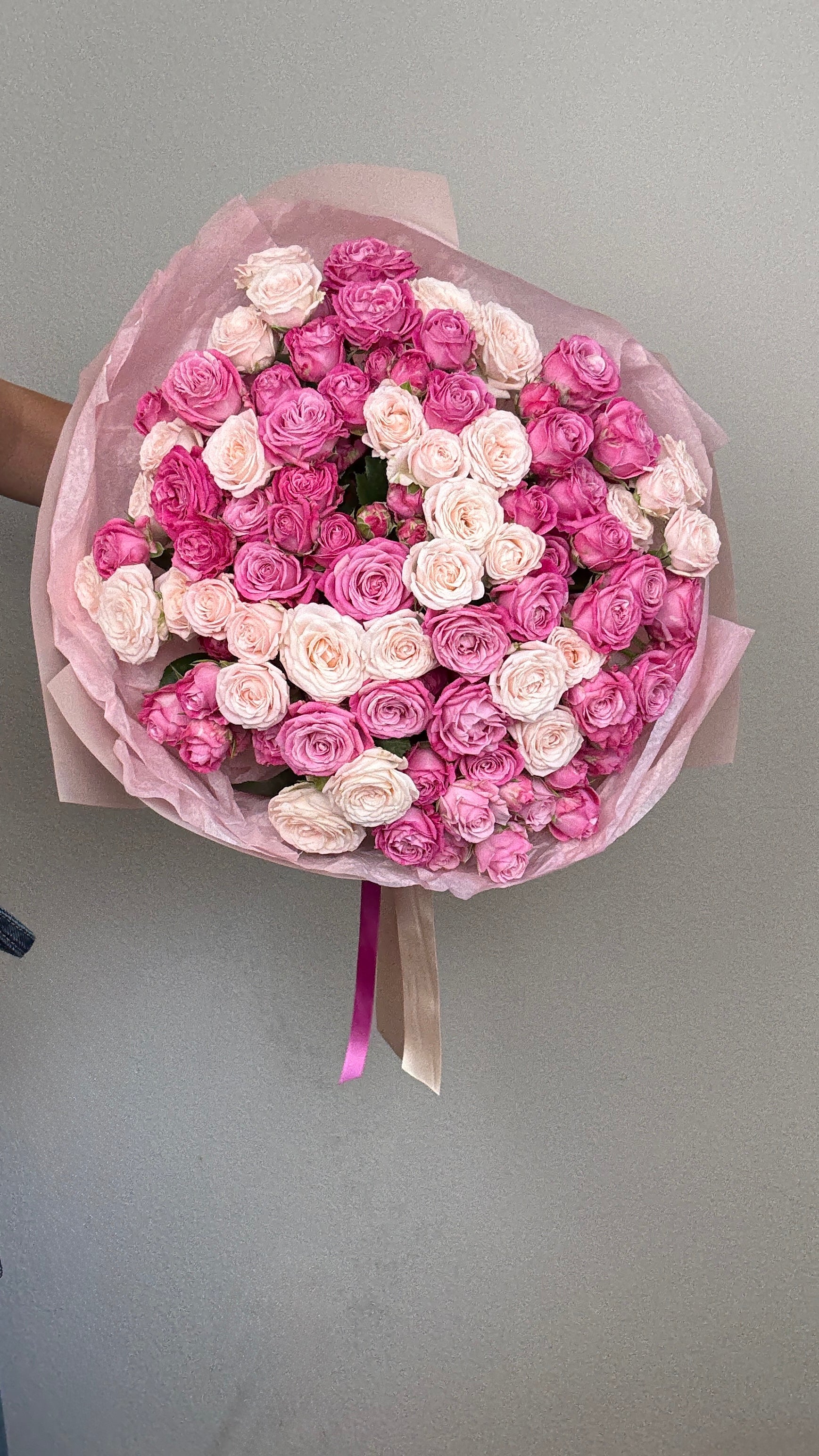 Make any occasion special with this stunning bouquet of premium pink spray roses. These delicate, multi-bloom roses symbolize elegance and charm, creating a breathtaking floral arrangement. Wrapped in soft pink paper and adorned with satin ribbons, this bouquet is perfect for birthdays, anniversaries, or simply to brighten someone’s day. Hand-tied with care, our fresh spray roses offer a lush, romantic aesthetic that makes a lasting impression. Order now for a beautiful gift that speaks from the heart!