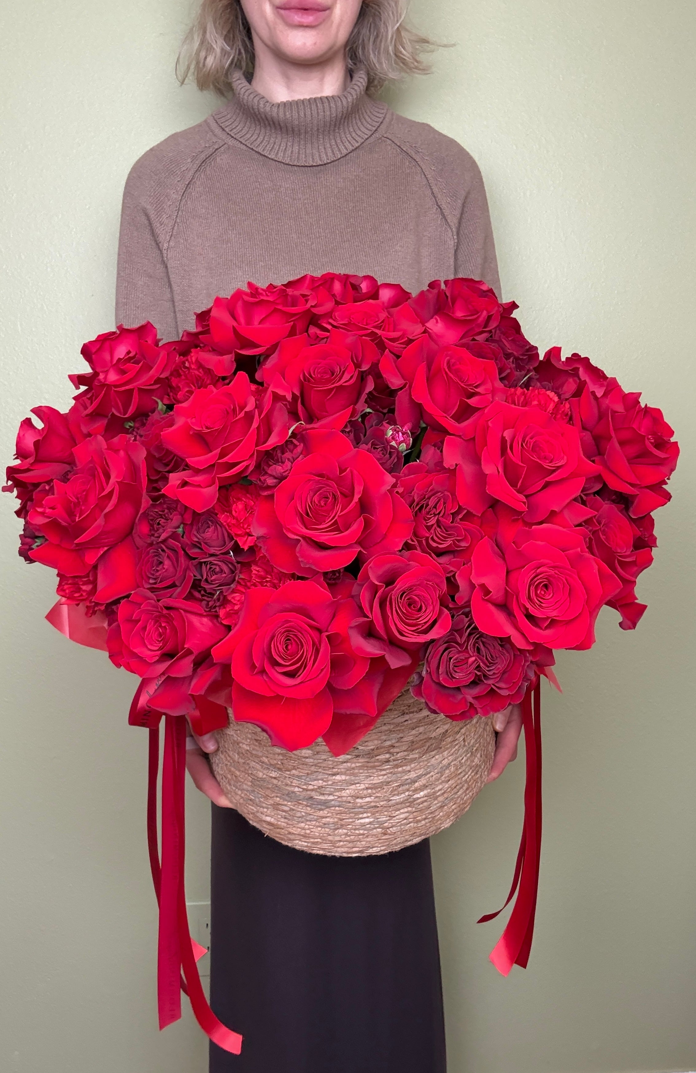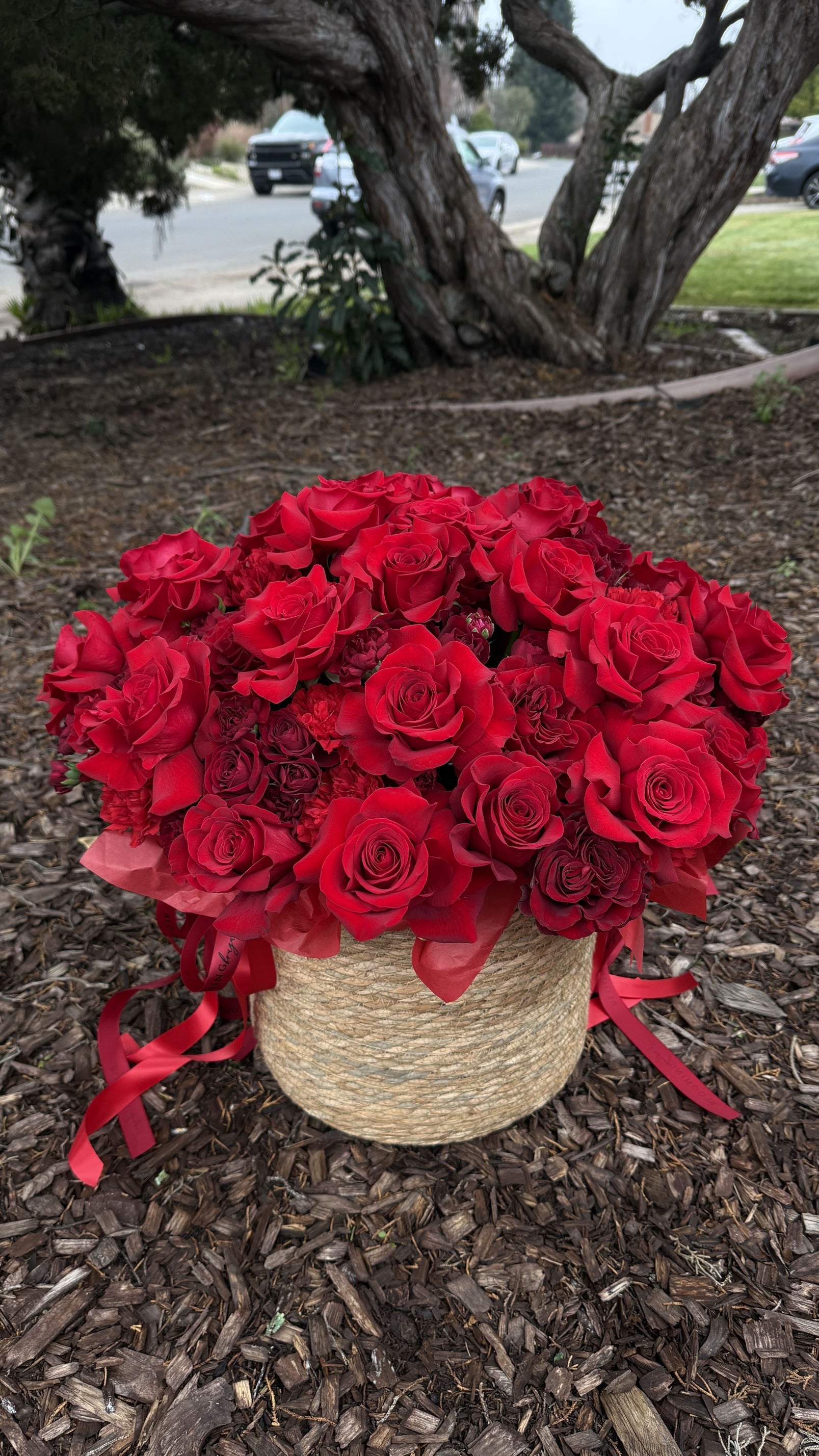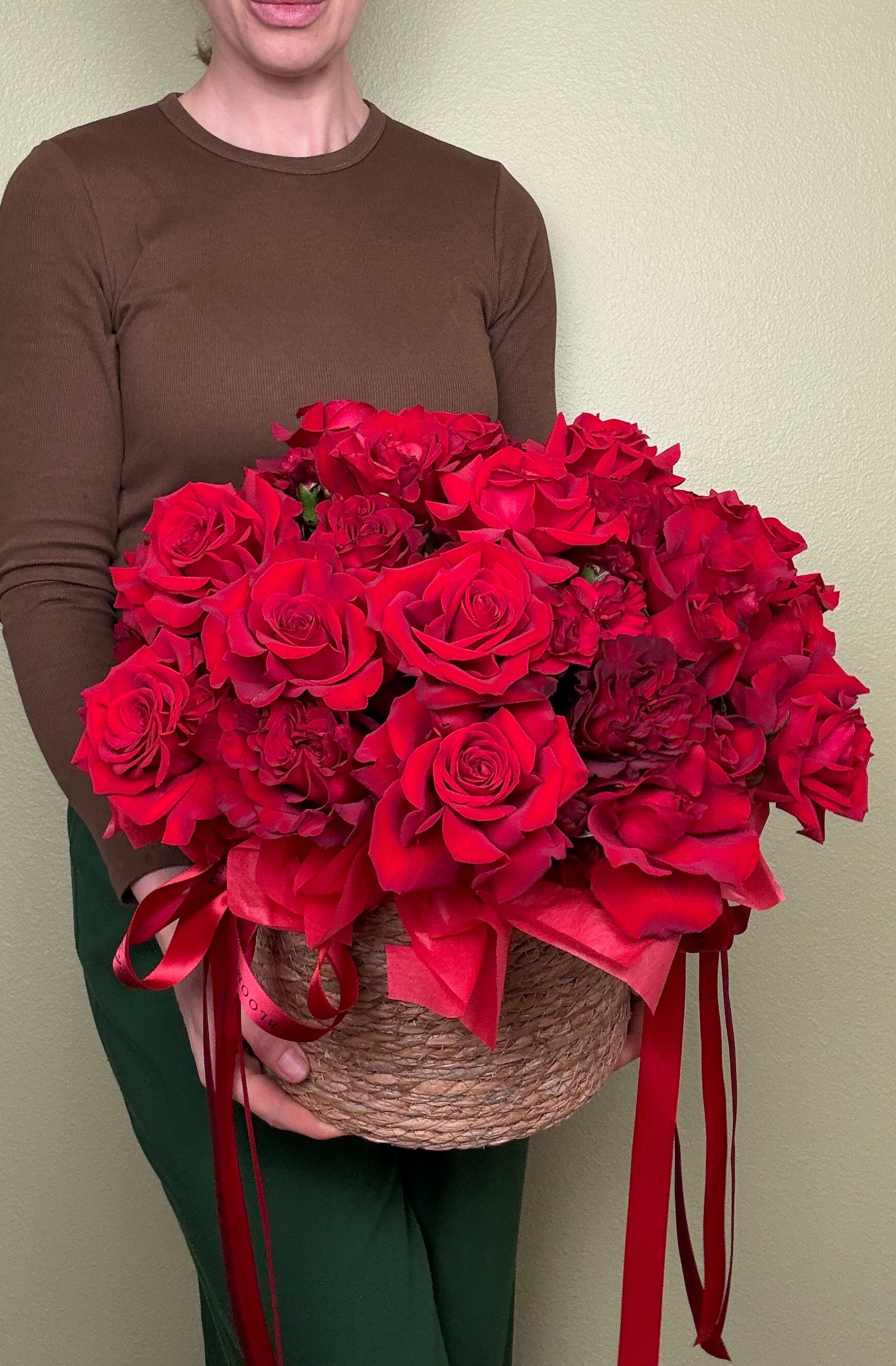 Capture the essence of Parisian romance with this enchanting basket of French roses. Each bloom is carefully selected for its lush, velvety petals and delicate fragrance, reminiscent of a stroll through a hidden garden in Paris. Artfully arranged in a charming, rustic basket, this composition is a testament to timeless elegance and heartfelt affection. It's more than a gift; it's a beautiful gesture that speaks the universal language of love.